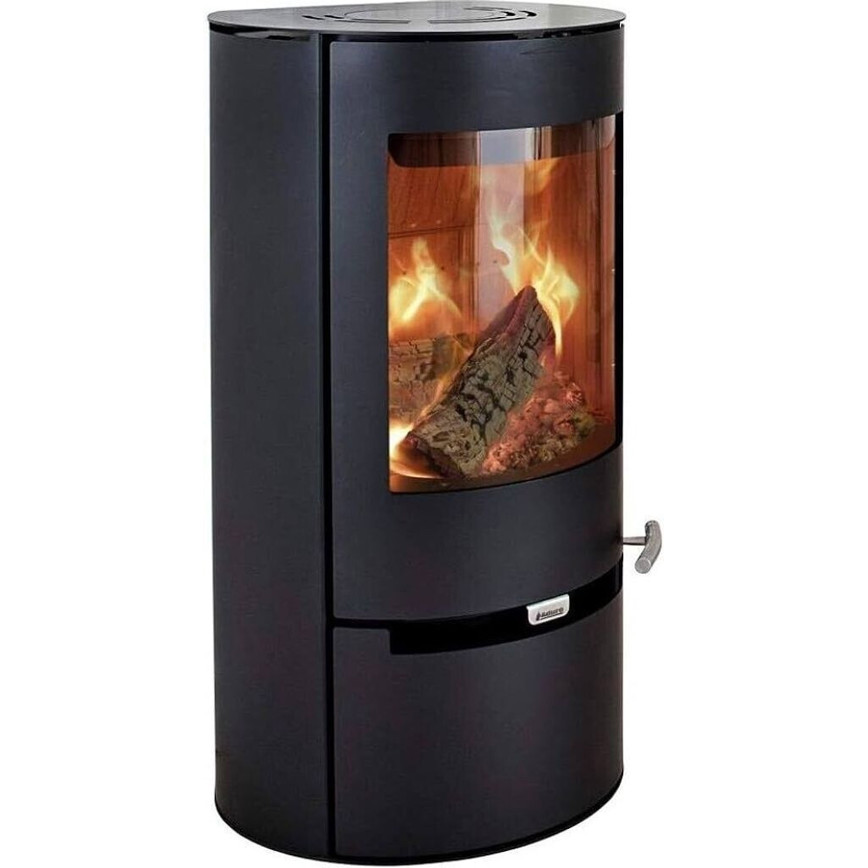 Die praktische Ausstattung mit einem Aschekasten und einem verdeckten Holzlagerfach bietet zusätzlichen Komfort und Funktionalität. Der Kaminofen ist für unterschiedliche Brennstoffe geeignet, darunter Brennholz und Holzbriketts, und erfüllt hohe Sicherheitsstandards mit einer selbstschließenden Tür und einer 1-fachen Türverriegelung.