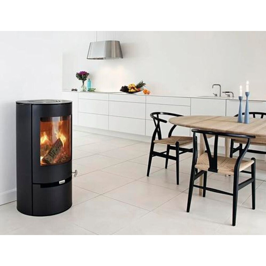 Dank der speziellen Scheibenspülung bleibt die Panorama Sichtscheibe stets klar und sorgt für einen perfekten Blick auf das Flammenspiel. Er ist freistehend und eignet sich somit ideal für jedes Wohnraumkonzept. Der Raumheizvermögen von bis zu 140 m³ ermöglicht es, auch größere Räume effizient zu beheizen.
