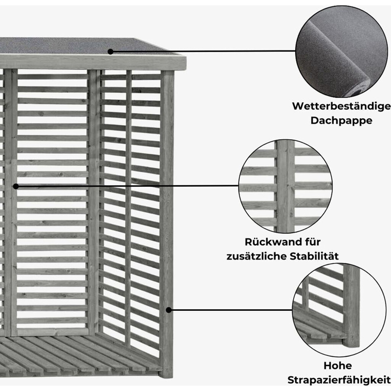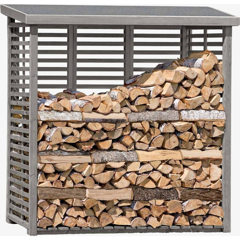 Dank der stabilen Rückwand bleibt Ihr Holz stets trocken und gut belüftet, was für eine optimale Lagerung sorgt. Die gehobelte Oberfläche verleiht dem Holzunterstand nicht nur eine ansprechende Optik, sondern schützt auch vor Schimmel und Verwitterung.